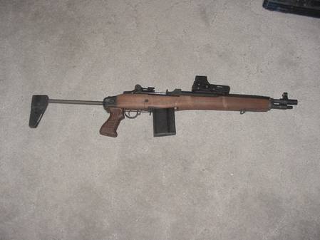 That there be my very own M1A SOCOM 16 with an EO Tech holosight, which, with the original Springfield syn stock, is THE 3-gun tac rifle. The Reese Surplus, Inc. stock is well made, a snug drop-in. And, it’s a real 30 cal riffle, not a poodle shooter.