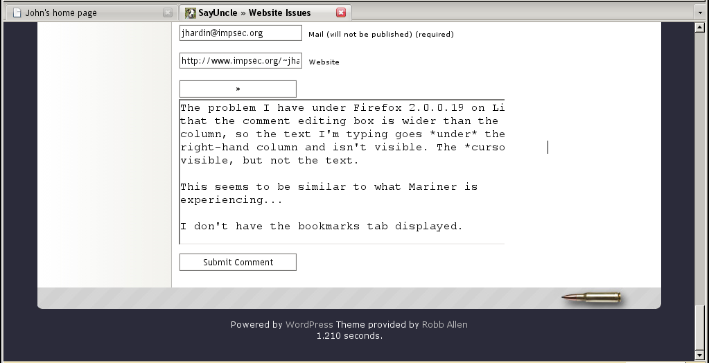 The problem I have under Firefox 2.0.0.19 on Linux is that the comment editing box is wider than the center column, so the text I’m typing goes *under* the right-hand column and isn’t visible. The *cursor* is visible, but not the text.